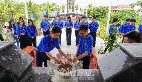 Lực lượng đoàn viên xã Trí Phải cùng Chi đoàn Trường Cao đẳng Cộng đồng Cà Mau về nguồn tại Khu Di tích “Bia kỷ niệm Bác Hồ với cây vú sữa miền Nam” tại xã Trí Phải.