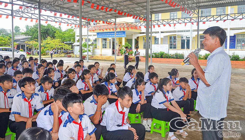 Ông Trần Trọng Nguyên, Phó Trưởng phòng Bảo trợ xã hội, hướng dẫn học sinh Trường THCS Phong Thạnh Tây A (xã Phong Hiệp) về số điện thoại 111 giải cứu, tư vấn, hỗ trợ cho trẻ em và các nạn nhân mua bán người.