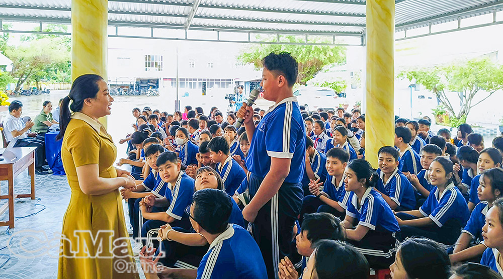 Các em học sinh Trường THCS Phong Thạnh Tây B (xã Phong Hiệp) trả lời các câu hỏi của học sinh về tệ nạn mại dâm, mua bán người.