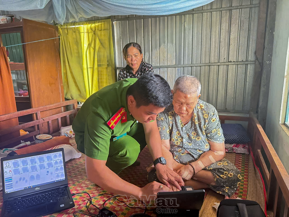 Công an xã Gành Hào cùng lực lượng an ninh trật tự cơ sở đến tận nhà cấp căn cước cho ông Lâm Văn Học (95 tuổi, ấp Bình Điền, xã Gành Hào).