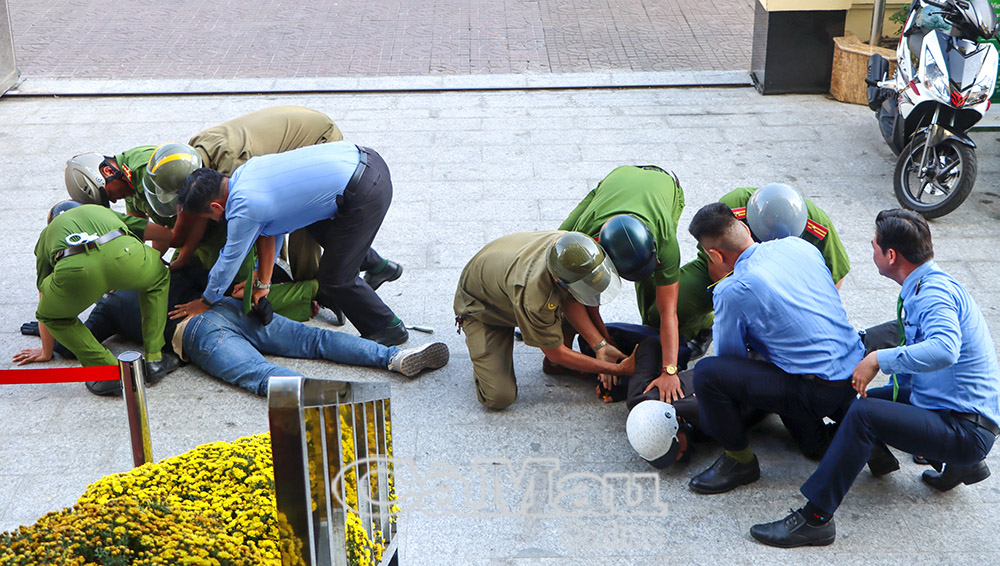 Trước tình huống trên, nhân viên ngân hàng vẫn giữ bình tĩnh, bí mật kích hoạt hệ thống báo động. Ngay sau khi nhận tín hiệu, lực lượng Cảnh sát 113, Cảnh sát cơ động, Cảnh sát hình sự, Cảnh sát giao thông và Công an cơ sở nhanh chóng triển khai phương án, khống chế, bắt giữ các đối tượng khi đang tìm cách tẩu thoát.