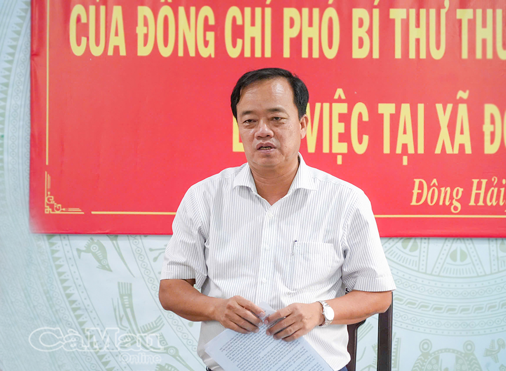 Tham gia đoàn công tác có các đồng chí: Lê Thanh Triều, Uỷ viên Ban Thường vụ Tỉnh uỷ, Phó Chủ tịch Thường trực Uỷ ban MTTQ Việt Nam tỉnh Cà Mau, phụ trách theo dõi, chỉ đạo Đảng bộ xã Đông Hải; Phan Hoàng Vũ, Phó Chủ tịch HĐND tỉnh; Ngô Vũ Thăng, Phó Chủ tịch UBND tỉnh, cùng lãnh đạo các sở, ngành tỉnh.