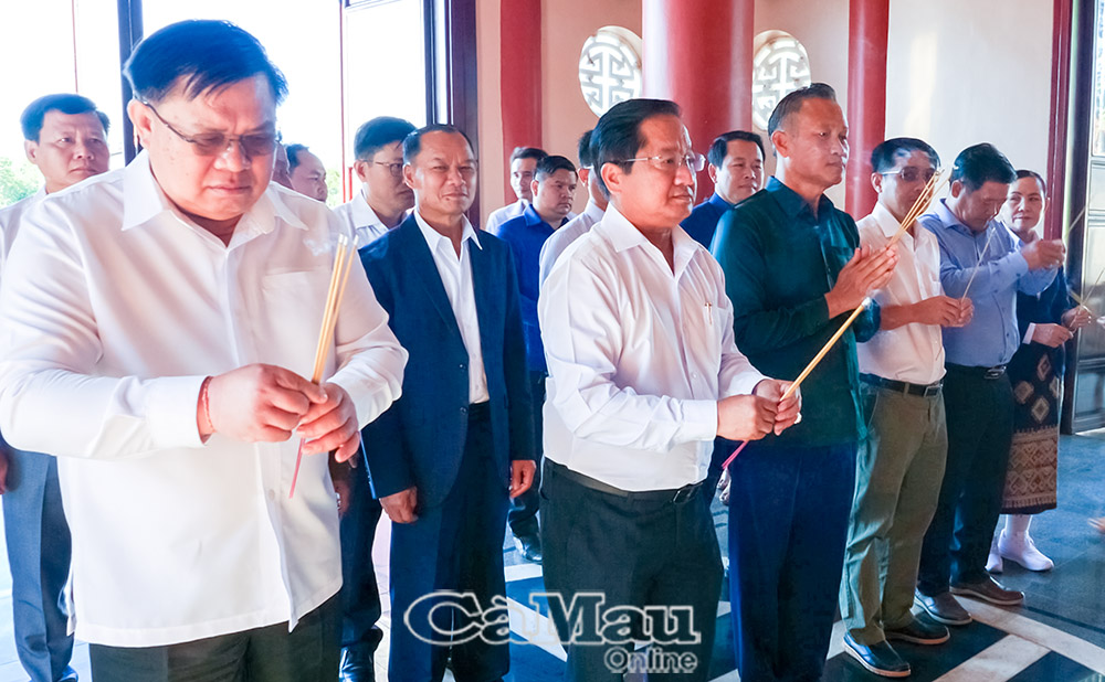 Đồng chí Lê Thanh Triều, Uỷ viên Ban Thường vụ Tỉnh uỷ, Phó Chủ tịch Thường trực Uỷ ban MTTQ Việt Nam tỉnh Cà Mau (hàng đầu, thứ hai từ trái sang) và ông Kẻo U Đon Bút Sỉ Nhuc Khỏn, Phó Tỉnh trưởng tỉnh Khăm Muồn, dâng hương tưởng niệm Chủ tịch Hồ Chí Minh.