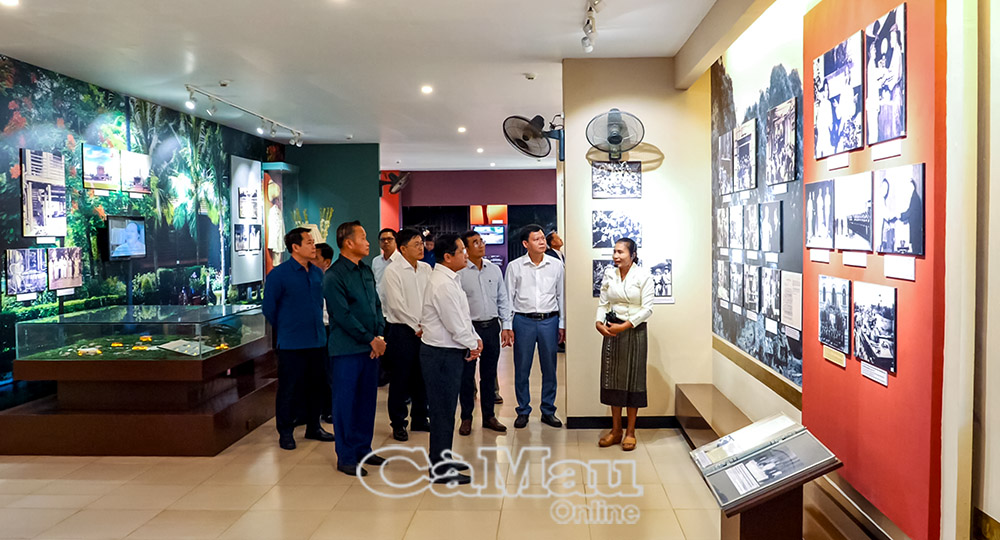 Đoàn cán bộ tỉnh Cà Mau và tỉnh Khăm Muồn tham quan Bảo tàng Chủ tịch Hồ Chí Minh, nghe giới thiệu về cuộc đời và hoạt động cách mạng của Người.