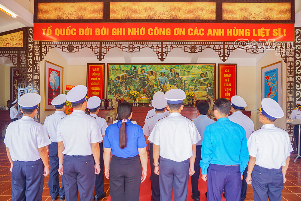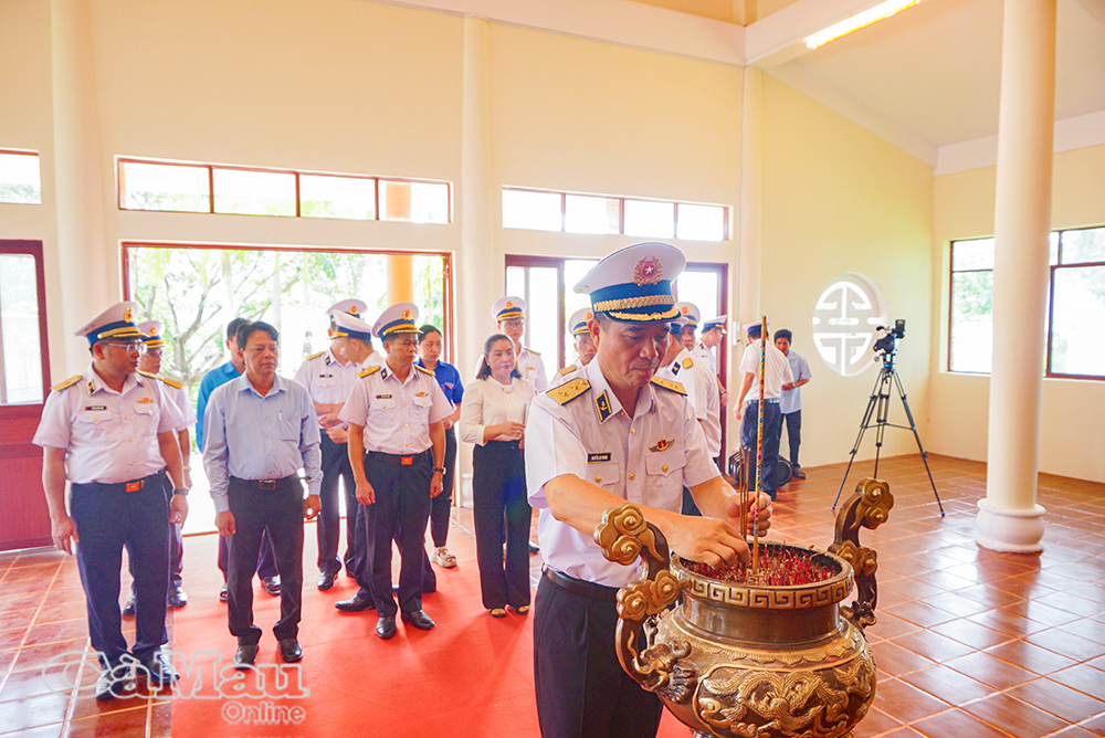 Đoàn công tác Quân chủng Hải quân cùng lãnh đạo xã Phan Ngọc Hiển dâng hương tại Khu di tích Quốc gia đặc biệt Bến Vàm Lũng.