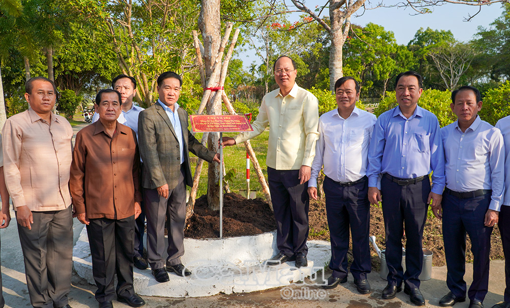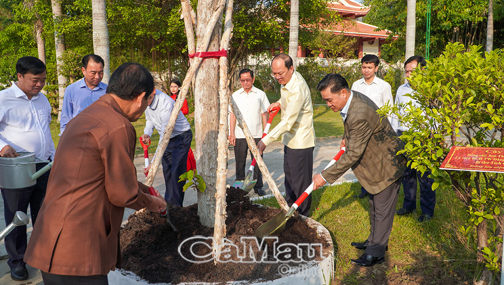 Nhằm lưu lại dấu ấn tốt đẹp trong chuyến thăm lần này, đồng chí Son Tha Nu-Thăm Ma Vông, Bí thư Tỉnh uỷ Bo-ly-kham-xay (thứ tư từ trái sang) và đồng chí Nguyễn Hồ Hải, Bí thư Tỉnh uỷ Cà Mau (thứ tư từ phải sang), cùng trồng cây lưu niệm trong khuôn viên Khu tưởng niệm Chủ tịch Hồ Chí Minh.
