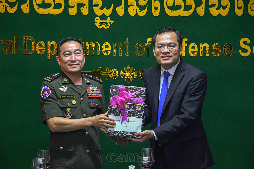Trung tướng Yong Mao, Phó Tổng Cục trưởng Tổng cục Dịch vụ quân sự (Bộ Quốc phòng Quân đội Hoàng gia Campuchia), tặng quà cảm ơn Phó Chủ tịch UBND tỉnh Cà Mau Ngô Vũ Thăng đã đến thăm, chúc Tết đơn vị.