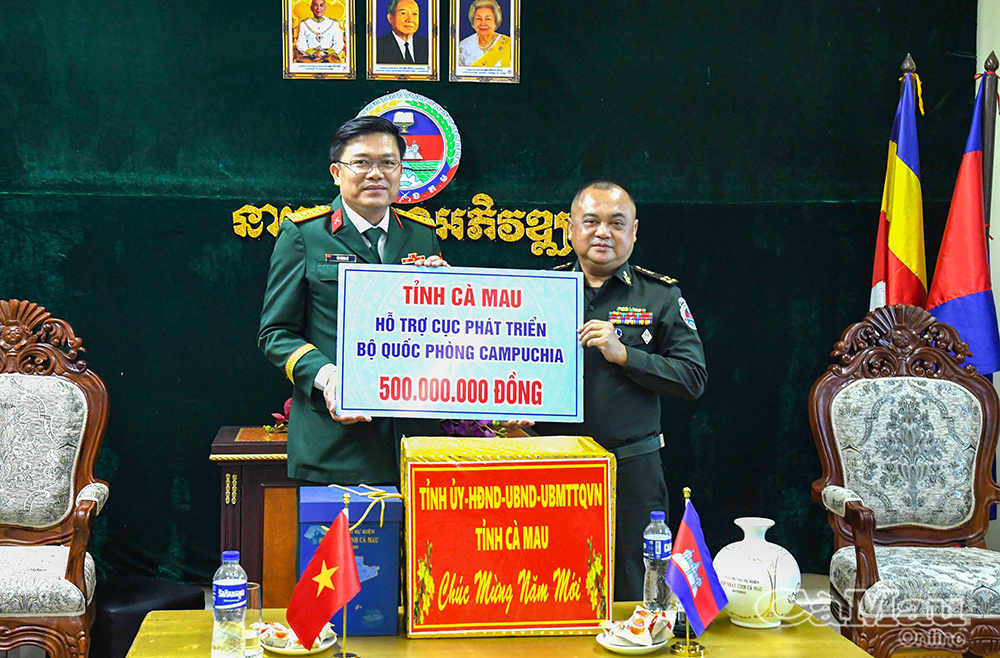 Dịp này, tỉnh Cà Mau đã trao tặng Cục Phát triển 500 triệu đồng để đầu tư xây dựng, nâng cấp cơ sở vật chất. Trong ảnh: Đại tá Võ Thành Lê, Chính uỷ Bộ Chỉ huy Quân sự tỉnh Cà Mau, trao bảng tượng trưng hỗ trợ 500 triệu đồng cho đại diện Cục Phát triển, Bộ Quốc phòng Campuchia.