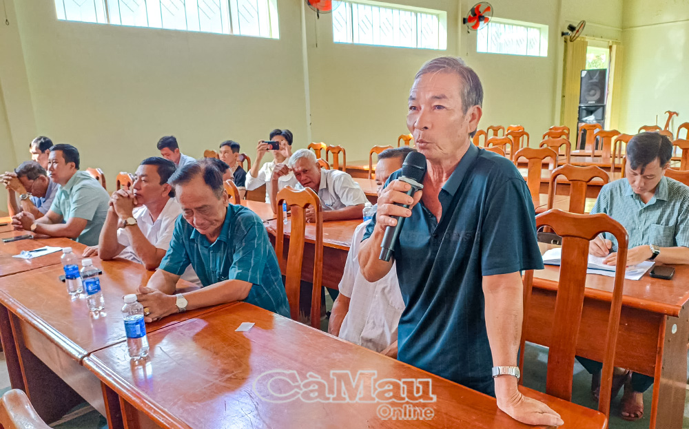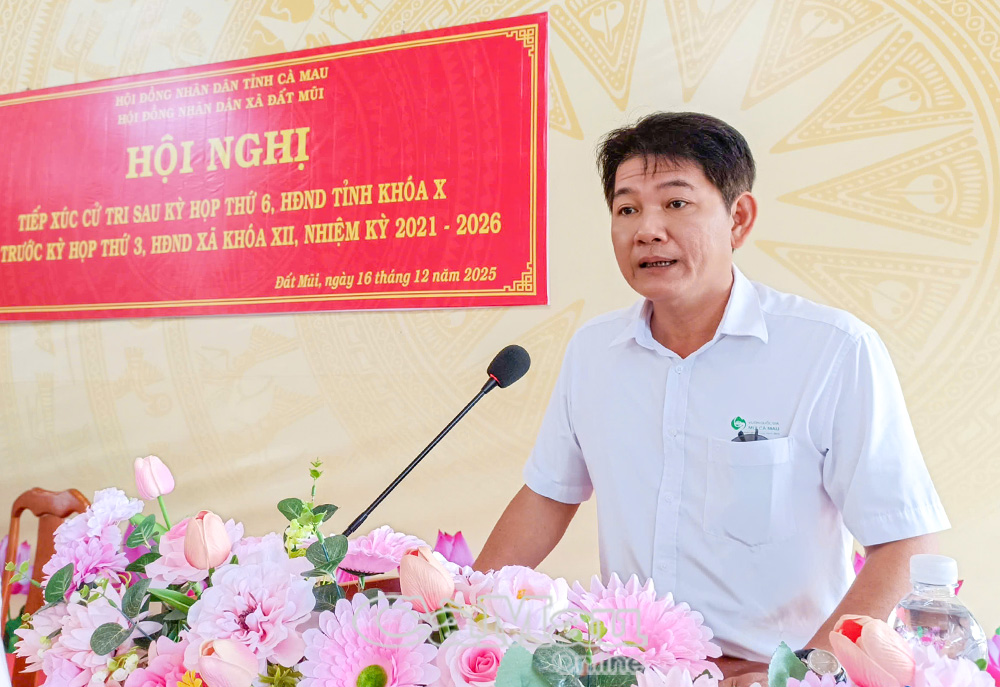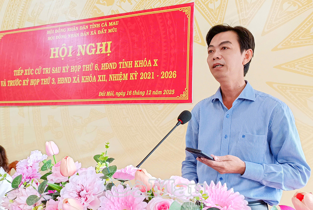 Ông Cao Văn Phú, Phó Bí thư Đảng uỷ, Chủ tịch UBND xã Đất Mũi thông tin những khó khăn của địa phương; tiếp thu, trả lời kiến nghị cử tri về di dời dân khu rẫy Trương Phi, đầu tư giao thông - du lịch, xử lý môi trường, ngăn chặn khai thác thuỷ sản huỷ diệt và chuyển đổi sinh kế cho người dân.