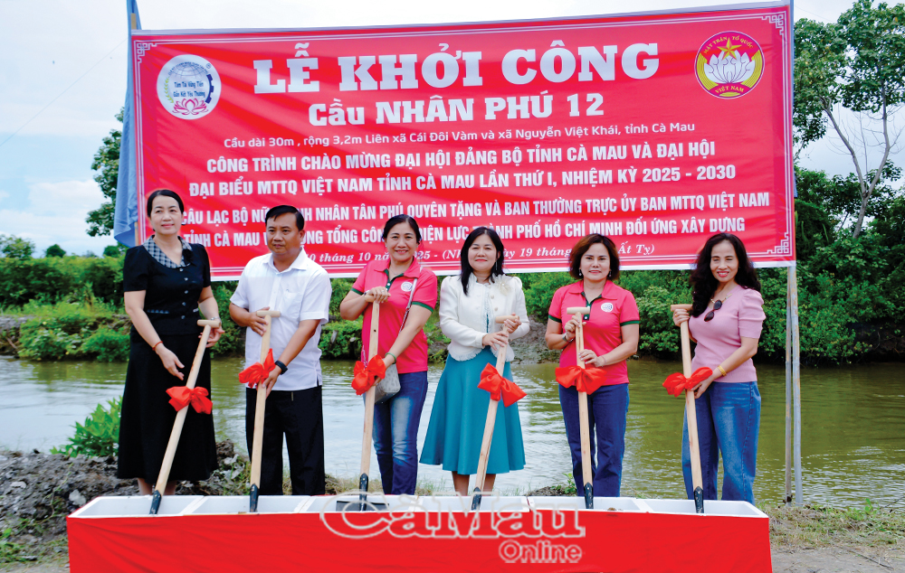 Phó Chủ tịch Uỷ ban MTTQ Việt Nam tỉnh Cà Mau Võ Thị Ngọc Hân (thứ ba từ phải sang) cùng chính quyền địa phương và nhà tài trợ thực hiện nghi thức động thổ xây dựng cầu giao thông nông thôn chào mừng Ðại hội Ðại biểu MTTQ Việt Nam tỉnh Cà Mau, nhiệm kỳ 2025-2030.