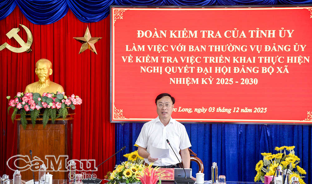 Báo Cà Mau Chiều 3/12, Đoàn kiểm tra số 40 của Tỉnh uỷ Cà Mau do đồng chí Huỳnh Hữu Trí, Uỷ viên Ban Thường vụ Tỉnh uỷ, Chủ nhiệm Uỷ ban Kiểm tra Tỉnh uỷ làm Trưởng đoàn, đã có buổi làm việc với Ban Thường vụ (BTV) Đảng uỷ xã Phước Long về việc triển khai thực hiện Nghị quyết Đại hội Đảng bộ xã nhiệm kỳ 2025-2030.