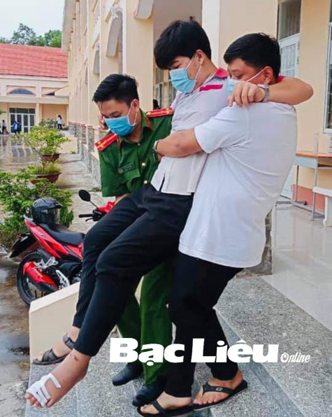 Đoàn viên - thanh niên Đoàn cơ sở Công an huyện Phước Long hỗ trợ thí sinh bị gãy chân đến điểm thi.