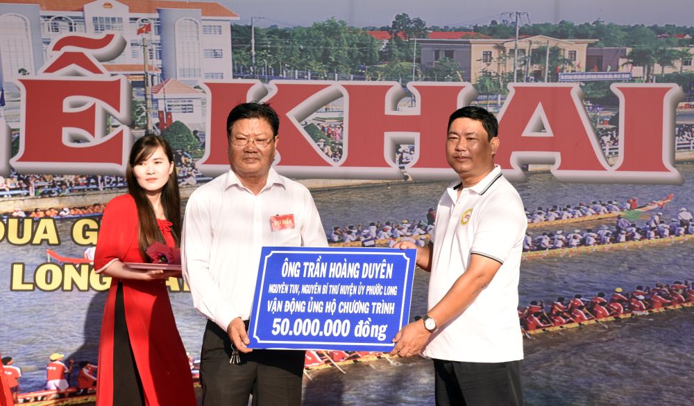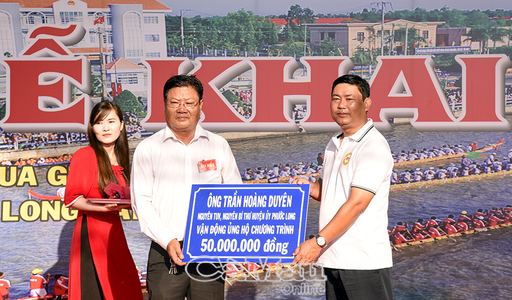 Ông Trần Hoàng Duyên (bên trái), nguyên Bí thư Huyện uỷ Phước Long, tỉnh Bạc Liêu (cũ), trao bảng tượng trưng tặng số tiền vận động 50 triệu đồng cho Ban Tổ chức giải.