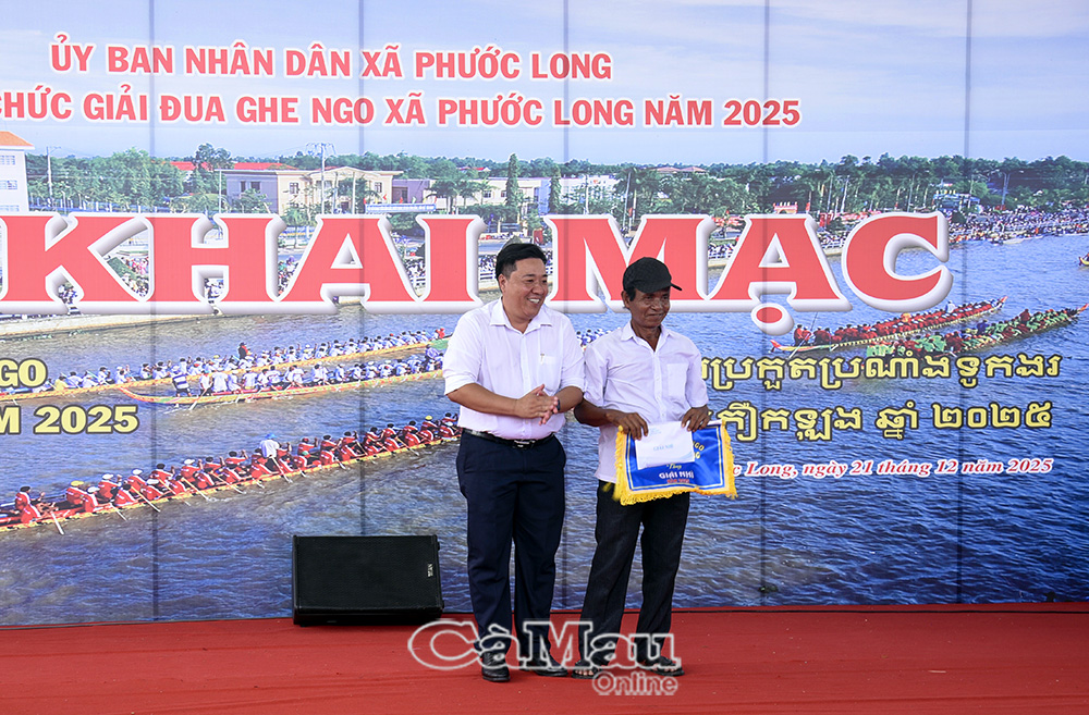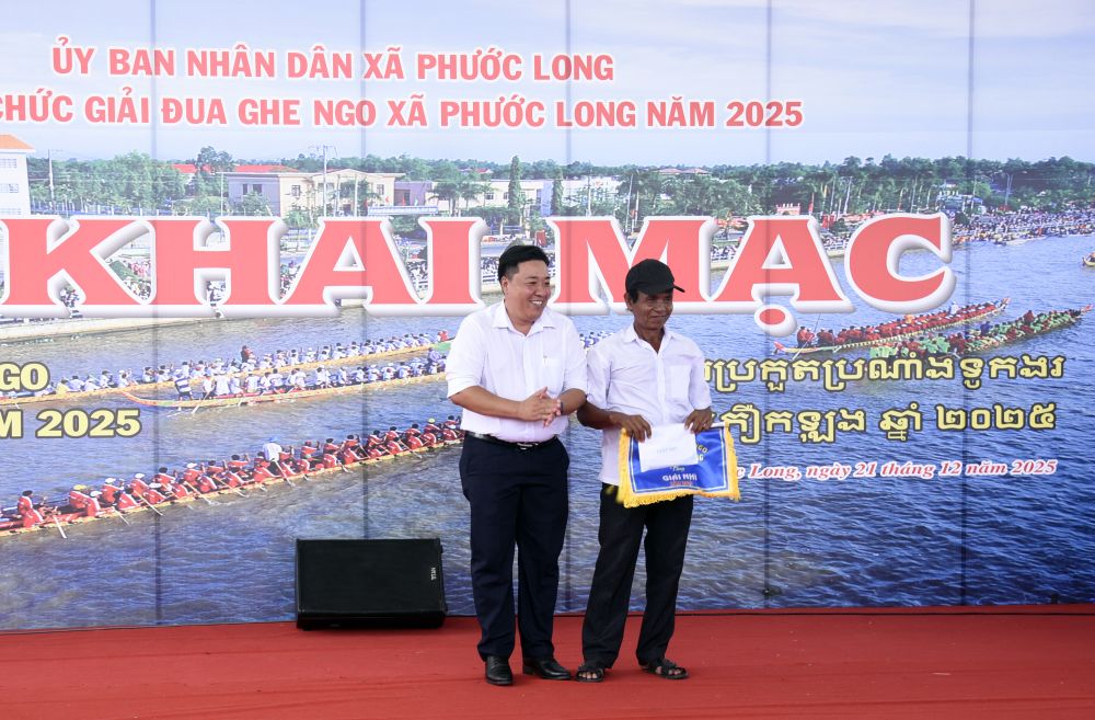 Ông Nguyễn Tấn Thức, Chủ tịch UBND xã Phước Long, trao giải Nhì cho đội ghe chùa Ngàn Dừa (Cà Mau).