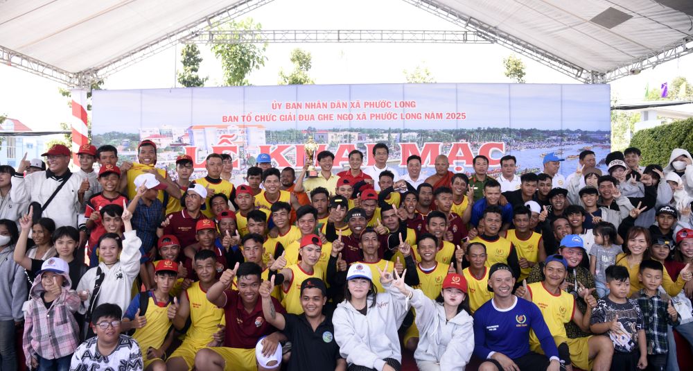 Đội ghe chùa Sro Lôn (TP Cần Thơ) xuất sắc giành giải Nhất, chụp ảnh lưu niệm cùng khán giả.