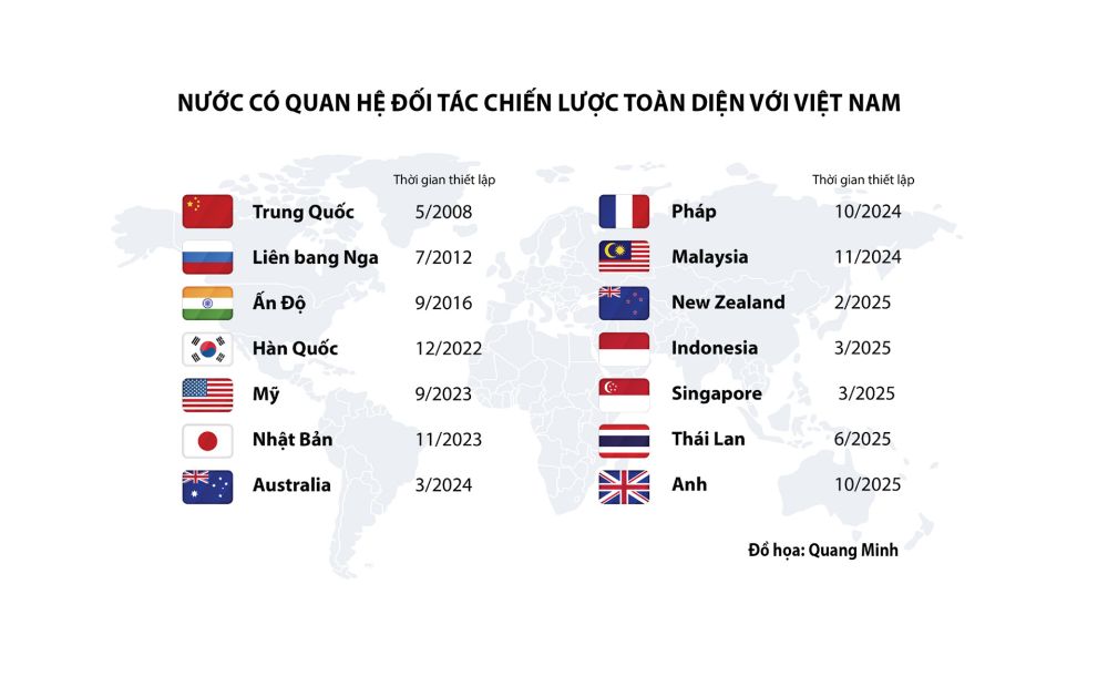 Nếu trước Đổi mới, Việt Nam chỉ có quan hệ với hơn 100 quốc gia, thì đến năm 2025 đã thiết lập quan hệ ngoại giao chính thức với tất cả các nước thành viên Liên hợp quốc. Đặc biệt, việc nâng cấp các khuôn khổ quan hệ đối tác với các nước là bước đi quan trọng trong tiến trình hội nhập quốc tế.