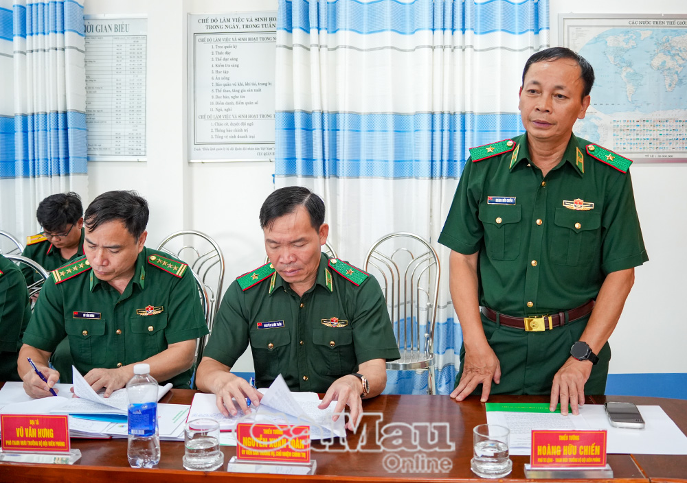 Trung tá Nguyễn Văn Lượm, Đồn Trưởng Đồn Biên phòng Hòn Khoai, báo cáo kết quả thực hiện nhiệm vụ với đoàn công tác.