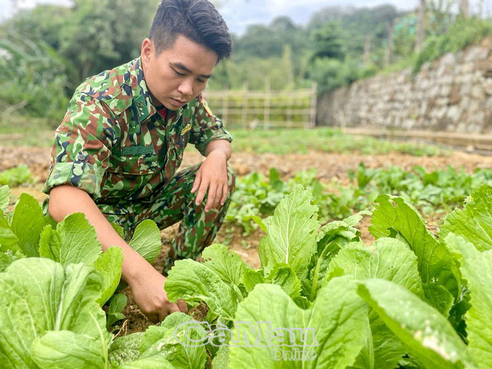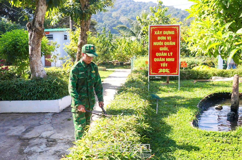 Khi bình minh vừa hé rạng qua những tầng mây mỏng, khu tăng gia sản xuất của đơn vị đã rộn rã tiếng nói cười. Những luống rau xanh mướt, giàn bầu bí trĩu quả, chuồng gà, ao cá được bố trí ngăn nắp, sạch sẽ như khu vườn mẫu giữa biển khơi. Ít ai ngờ rằng, trong điều kiện khí hậu khắc nghiệt, đất đá cằn cỗi của đảo xa, từ đôi tay cần mẫn và ý chí bền bỉ của người lính biên phòng đã vun xới nên màu xanh non ấy.