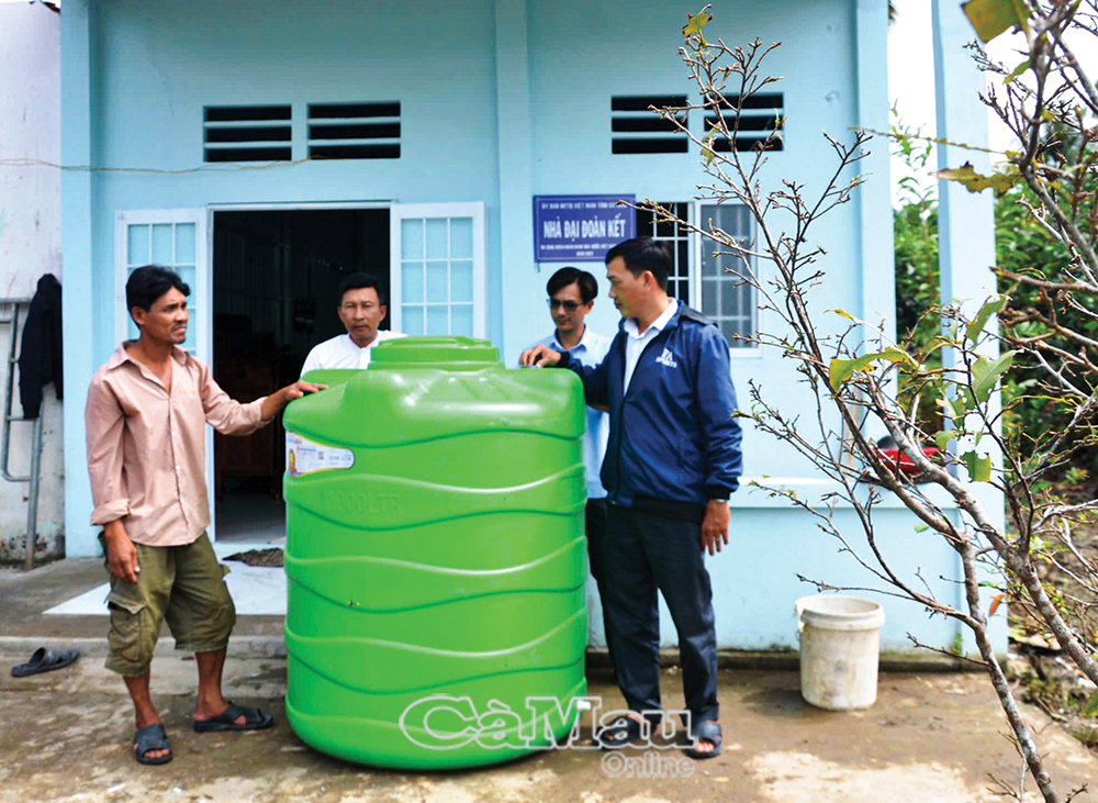 Anh Huỳnh Quốc Nam (bìa trái) chia sẻ niềm vui với cán bộ địa phương khi vừa có được nhà mới, vừa được hỗ trợ bồn chứa nước sinh hoạt.
