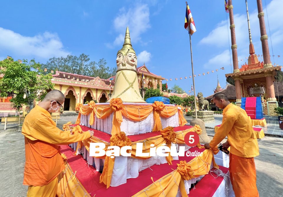 Với ý nghĩa chùa là “ngôi nhà” chung của đồng bào Khmer, do đó mọi người dân đều đến chùa trong dịp Tết cổ truyền để tham gia các nghi lễ truyền thống như: rước Đại lịch, chúc phúc, tạ ơn, cầu siêu… (ảnh 4). Đặc biệt, lễ đắp núi cát, lễ tắm Phật được tổ chức trang trọng với ước mong các vị Thần, Phật phù hộ cho phum sóc an lành, mùa màng bội thu, cuộc sống của người dân được ấm no, hạnh phúc trong năm mới (ảnh 5 và 6).