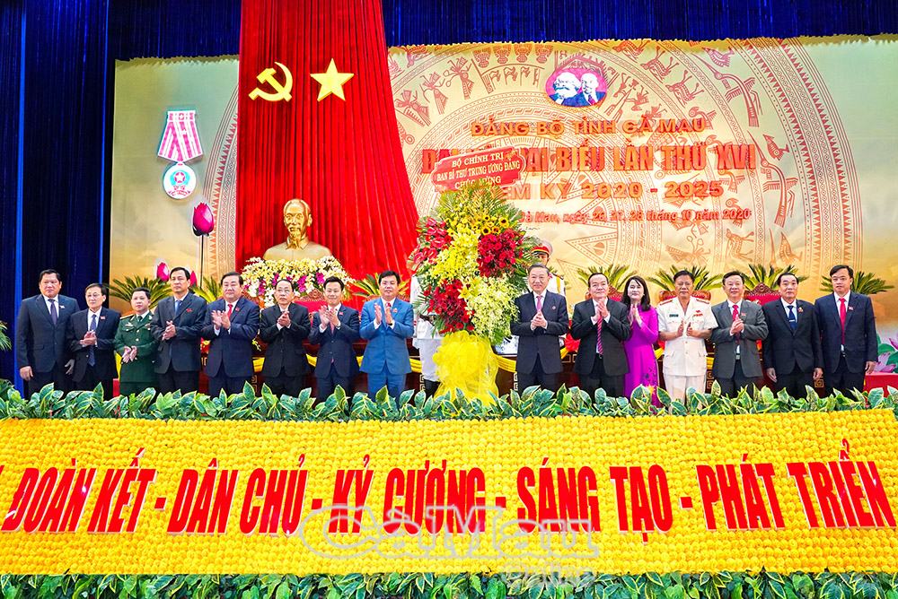 Ðại tướng Tô Lâm, Uỷ viên Bộ Chính trị, Bộ trưởng Bộ Công an (nay là Tổng Bí thư Ban Chấp hành Trung ương Ðảng), thay mặt Bộ Chính trị chỉ đạo đại hội và tặng hoa chúc mừng Ðại hội đại biểu Ðảng bộ tỉnh Cà Mau lần thứ XVI, nhiệm kỳ 2020-2025. Ảnh: HUỲNH LÂM