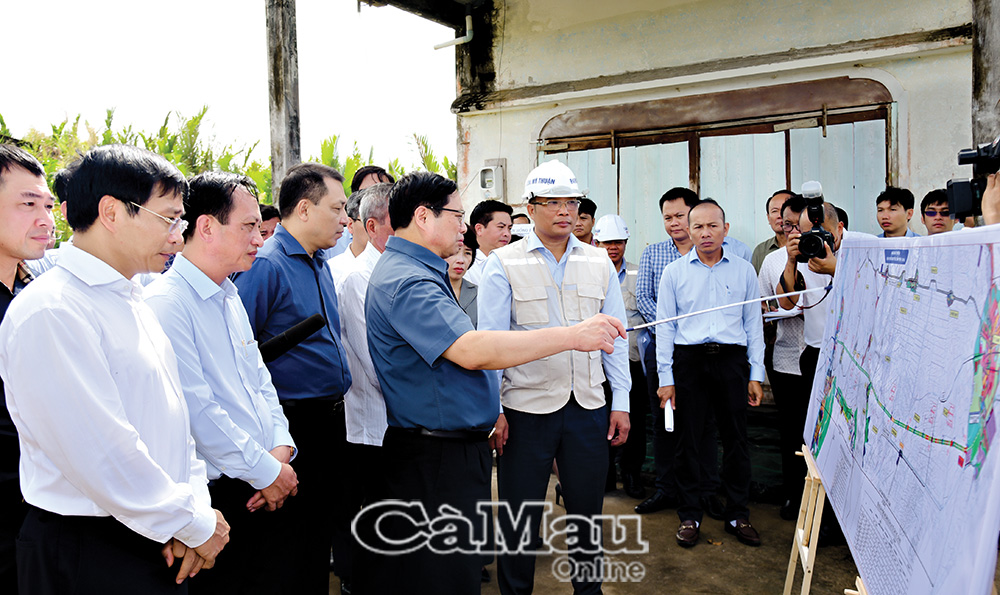 Thủ tướng Chính phủ Phạm Minh Chính kiểm tra, chỉ đạo tiến độ triển khai Dự án cao tốc Cần Thơ - Cà Mau, đoạn qua Bạc Liêu, năm 2022. Ảnh: HỮU THỌ