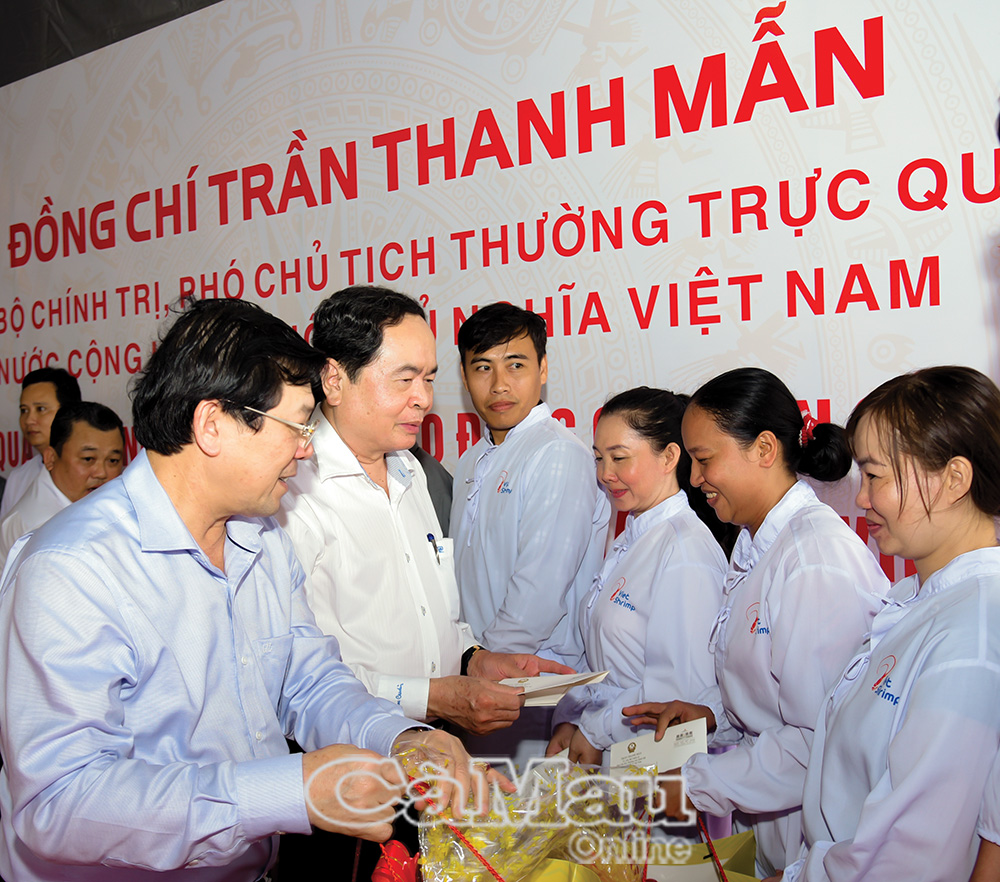 Phó Chủ tịch Thường trực Quốc hội Trần Thanh Mẫn (nay là Uỷ viên Bộ Chính trị, Chủ tịch Quốc hội) thăm, tặng quà công nhân chế biến thuỷ sản tại xã Vĩnh Trạch (nay là phường Vĩnh Trạch), năm 2023. Ảnh: HỮU THỌ