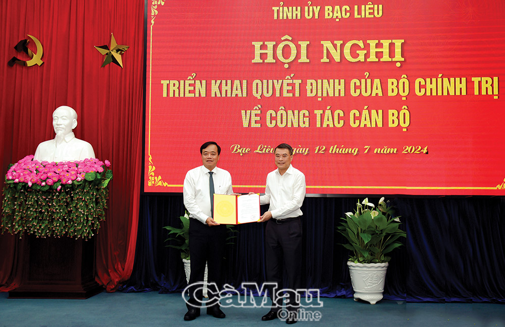 Ðồng chí Lê Minh Hưng, Uỷ viên Bộ Chính trị, Bí thư Trung ương Ðảng, Trưởng ban Tổ chức Trung ương trao Quyết định của Bộ Chính trị điều động, chỉ định đồng chí Huỳnh Quốc Việt giữ chức Phó Bí thư Tỉnh uỷ Bạc Liêu, tháng 7/2024. Ảnh: HỮU THỌ