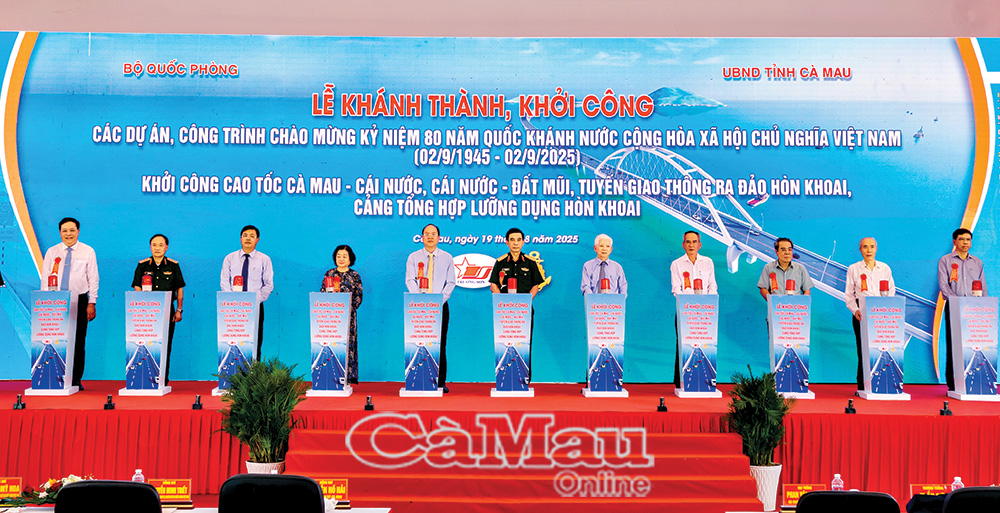 Ðại tướng Phan Văn Giang, Uỷ viên Bộ Chính trị, Bộ trưởng Bộ Quốc phòng (thứ sáu từ trái sang); các đồng chí nguyên lãnh đạo Ðảng, Nhà nước; các đồng chí lãnh đạo, nguyên lãnh đạo tỉnh Cà Mau thực hiện nghi thức khởi công Dự án cao tốc từ Cà Mau đến Ðất Mũi, tuyến giao thông ra đảo Hòn Khoai và Cảng tổng hợp lưỡng dụng Hòn Khoai (tháng 8/2025). Ảnh: HUỲNH LÂM