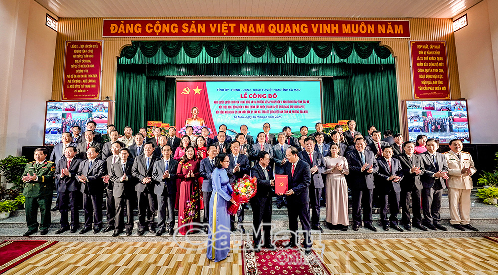 Phó Chủ tịch Quốc hội Lê Minh Hoan trao Nghị quyết, Quyết định của Trung ương và địa phương về sáp nhập đơn vị hành chính cấp tỉnh, cấp xã tại Cà Mau. Ảnh: HUỲNH LÂM