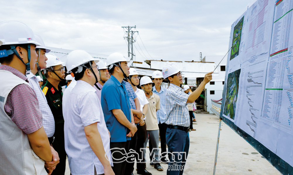Phó Bí thư Tỉnh uỷ, Chủ tịch UBND tỉnh Lữ Quang Ngời (hàng đầu, thứ ba từ trái sang) cùng đoàn công tác nghe đơn vị thi công báo cáo về tiến độ thực hiện Dự án xây dựng Bệnh viện Ða khoa Cà Mau quy mô 1.200 giường. Ảnh: TRẦN NGUYÊN
