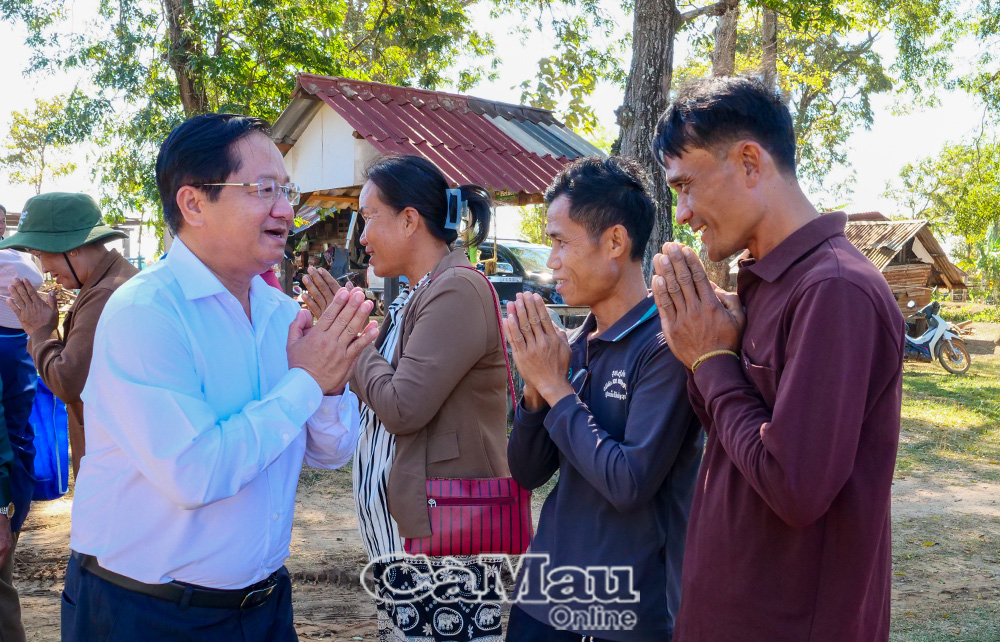 Ðồng chí Lê Thanh Triều, Uỷ viên Ban Thường vụ Tỉnh uỷ, Phó Chủ tịch Thường trực Uỷ ban MTTQ Việt Nam tỉnh Cà Mau và đoàn cán bộ tỉnh Cà Mau được nông dân tỉnh Khăm Muồn vui mừng chào đón.
