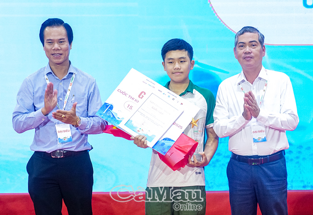 Ông Quách Văn Ấn(bìa trái), Phó Giám đốc Sở KH&CN, Trưởng Ban tổ chức cuộc thi Khởi nghiệp và Sự kiện CamaUP'25, trao giải Nhất cho dự án “Viên nang cứng chứa cao chuẩn hoá từ lá mắm hỗ trợ bảo vệ gan”.