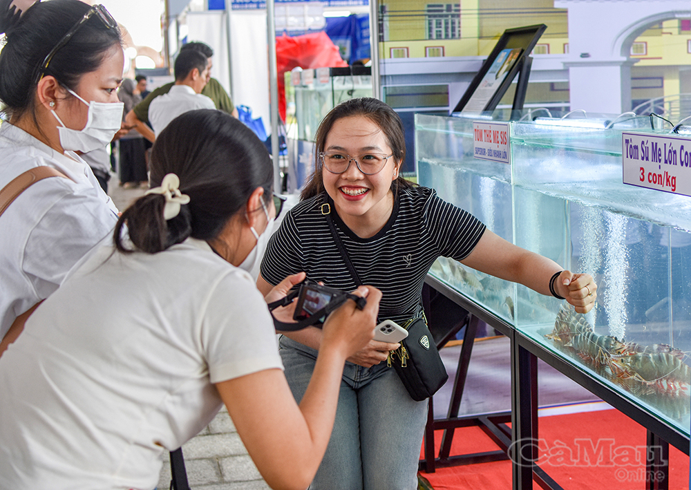 Nếu khu mô hình kỹ thuật tạo sự tò mò, thì khu trưng bày tôm - cua kích cỡ lớn lại khiến du khách liên tục trầm trồ. Nhiều người tranh thủ chụp ảnh, quay video và livestream để chia sẻ về các loại thuỷ sản “khủng”. Một số hộ nuôi còn mang đến ngày hội những mẫu tôm, cua biển nuôi theo hướng hữu cơ, có chứng nhận sạch và an toàn, thu hút sự quan tâm của đông đảo khách tham quan. Đây là minh chứng rõ nét cho sự thay đổi trong tư duy sản xuất của người dân địa phương.