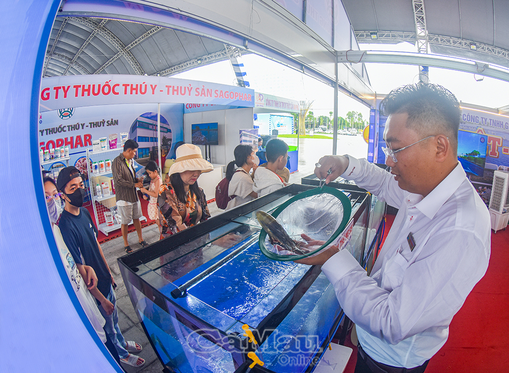 Khu trưng bày mô hình nuôi thuỷ sản ứng dụng công nghệ cao luôn chật kín người tham quan. Trên những tấm pano lớn, các đơn vị giới thiệu tổng quan về các hệ thống nuôi tiên tiến như bể nuôi tuần hoàn, mô hình nuôi tôm hai giai đoạn, nuôi kết hợp đa loài… Cùng với hình ảnh, các mô hình mô phỏng quy mô nhỏ được dựng ngay trong khuôn viên, giúp du khách dễ dàng quan sát và hình dung quy trình vận hành.