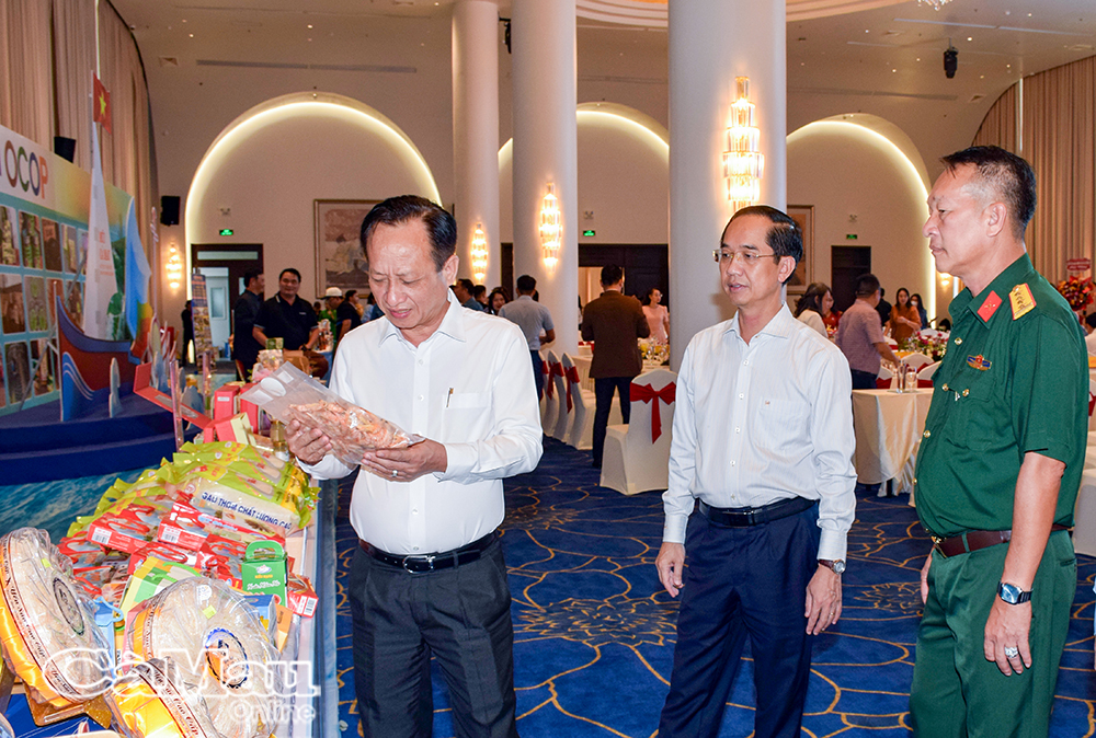 Các đồng chí lãnh đạo tỉnh tham quan trưng bày sản phẩm OCOP tại Hội thảo “Định vị thương hiệu du lịch Cà Mau trong tổng thể du lịch quốc gia”.