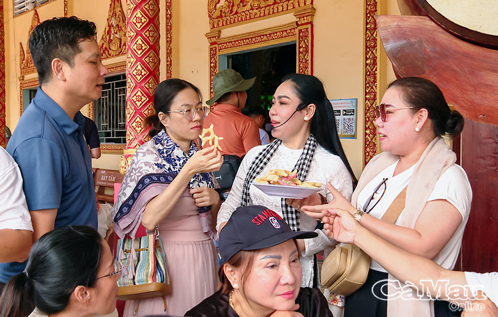 Các doanh nghiệp lữ hành thưởng thức món bánh gừng của đồng bào Khmer tại chùa Xiêm Cán.
