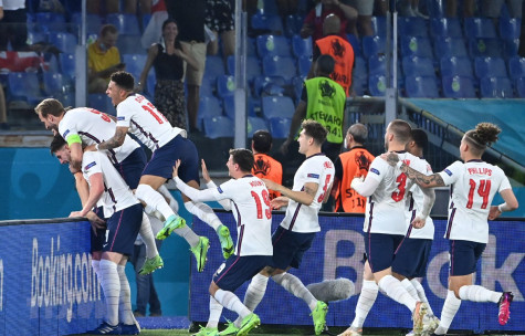 Niềm vui chiến thắng của các cầu thủ Anh trong trận tứ kết EURO 2020 gặp Ukraine ở Rome (Italy) ngày 3/7/2021. Ảnh: AFP/TTXVN