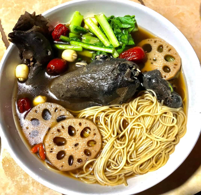 Trong số các món ăn của người Hoa ở Bạc Liêu, không thể không nhắc đến món gà ác tiềm thuốc bắc. Đây là món ăn giàu chất dinh dưỡng, được chế biến khá công phu và nấu với các vị thuốc có lợi cho sức khỏe. Cùng một khẩu phần ăn, nhưng món gà tiềm thuốc bắc sẽ đắt tiền hơn so với một phần ăn của các món khác như: phở bò, bò kho, cơm sườn… Do vậy, ngay từ khâu chọn nguyên liệu cũng sẽ được chọn lựa kỹ càng. Gà ác phải chọn từ những con hoàn toàn khỏe mạnh, to hơn nắm tay. Sau khi làm sạch, gà sẽ được khử mùi cẩn thận với rượu và gừng. Các vị thuốc bắc như đẳng sâm, hà thủ ô, hoài sơn, kỷ tử, táo đỏ, long nhãn… được ngâm nở trong nước nóng, rửa sạch qua nước ấm và để ráo nước hẳn rồi mới cho vào nồi hầm cùng gà, một số loại thảo mộc và gia vị. Trong đó, một trong những gia vị không thể thiếu để giúp món ăn ngon hơn là mật ong. Gà sẽ được nấu từ 1,5 - 2 tiếng đồng hồ, hoặc có thể nhanh hơn hay lâu hơn thời gian này, tùy vào trọng lượng to hay vừa. Sau khi gà chín mềm sẽ được chia thành từng phần ăn riêng trong thố hoặc tô.
