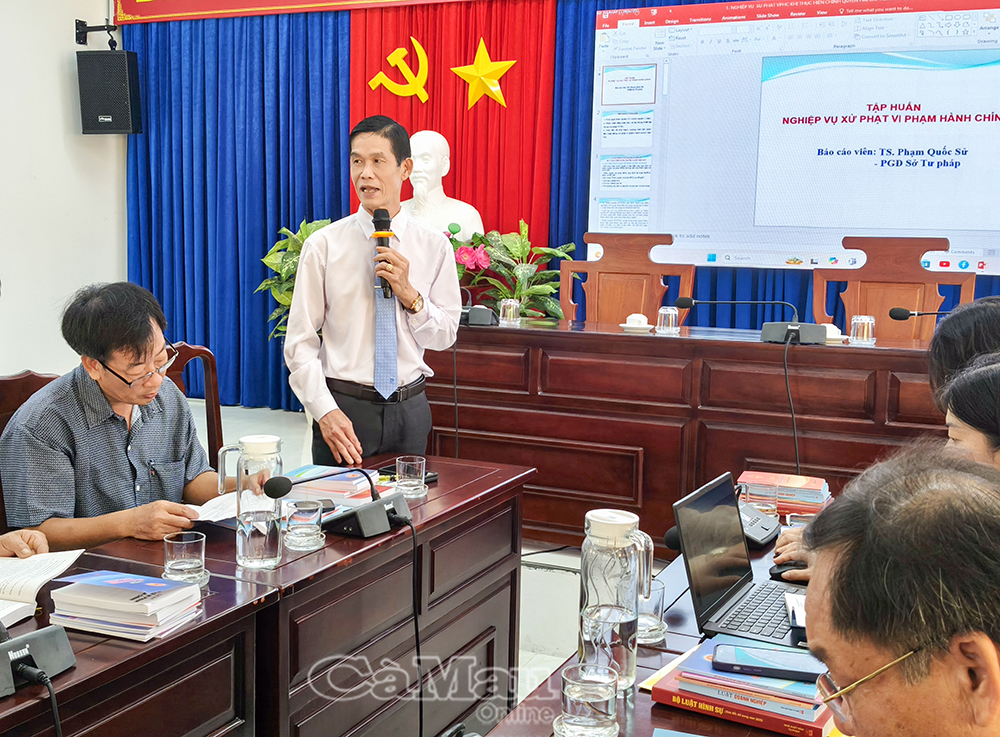 Ông Phạm Quốc Sử, Phó Giám đốc Sở Tư pháp, báo cáo chuyên đề Luật sửa đổi, bổ sung một số điều của Luật Xử lý vi phạm hành chính.