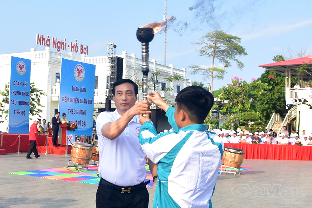 Vận động viên tiêu biểu Cụm số 13 trao ngọn đuốc truyền thống cho ông Hồ Văn Linh, Bí thư Đảng uỷ, Chủ tịch HĐND xã Hoà Bình, để thắp lửa truyền thống suốt những ngày diễn ra Đại hội.