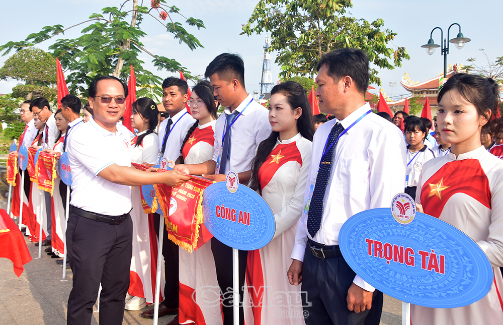Phó Giám đốc Sở Văn hoá, Thể thao và Du lịch Nguyễn Chí Công trao cờ lưu niệm cho các đoàn vận động viên.