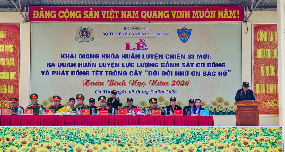 Báo Cà Mau Sáng 9/3, tại Tiểu đoàn 4, Trung đoàn Cảnh sát cơ động Tây Nam Bộ, thuộc Bộ Tư lệnh Cảnh sát cơ động - Bộ Công an (đóng trên địa bàn xã Hoà Bình, tỉnh Cà Mau), đơn vị tổ chức lễ khai giảng khoá huấn luyện chiến sĩ mới, huấn luyện lực lượng cảnh sát cơ động (CSCĐ) và phát động Tết trồng cây năm 2026.