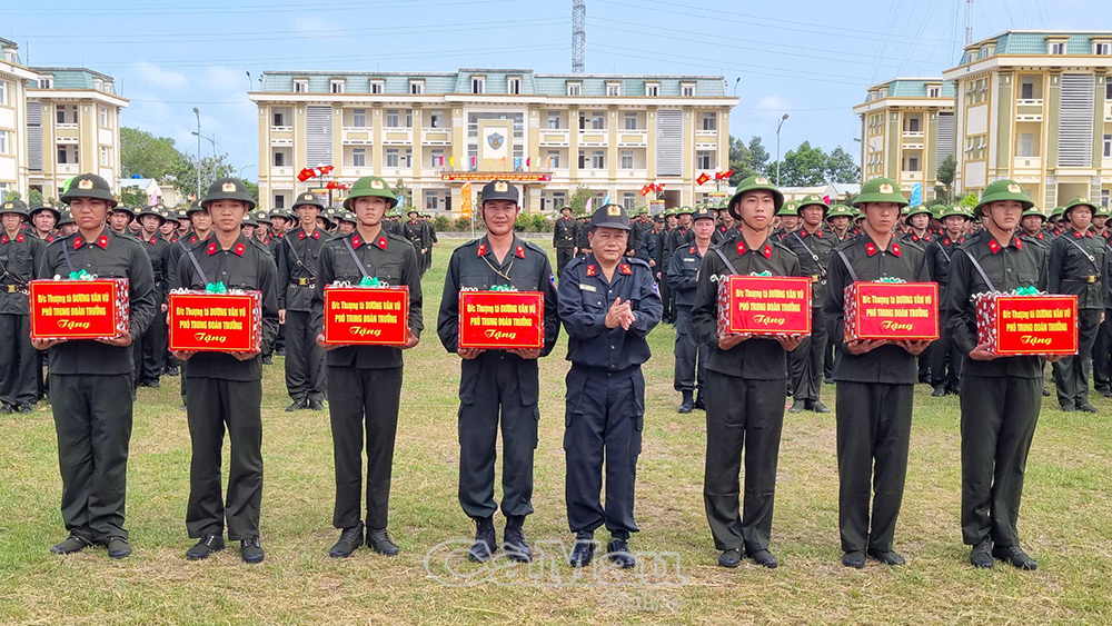 Thượng tá Dương Văn Vũ, Phó Trung đoàn trưởng Trung đoàn Cảnh sát cơ động Tây Nam Bộ, tặng quà cho đại diện các chiến sĩ tham gia khoá huấn luyện tại Tiểu đoàn 4.