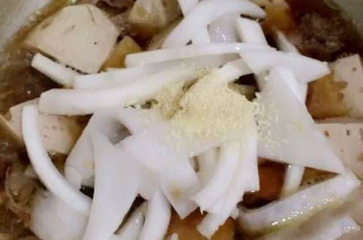 - Khi nước dừa bắt đầu sôi nhẹ, cho cùi dừa vào cùng các gia vị: nước mắm, nước tương, hạt nêm và một chút đường để cân vị.