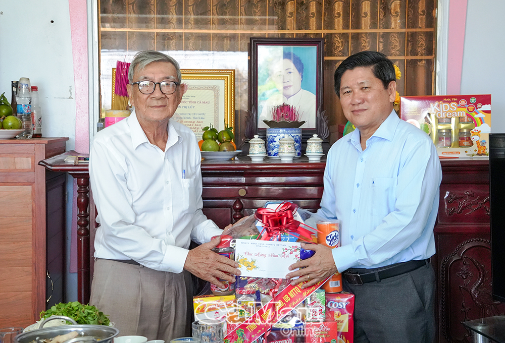 Phó Chủ tịch UBND tỉnh Cà Mau Lê Văn Sử tặng quà Tết đến ông Lê Chí Cường.