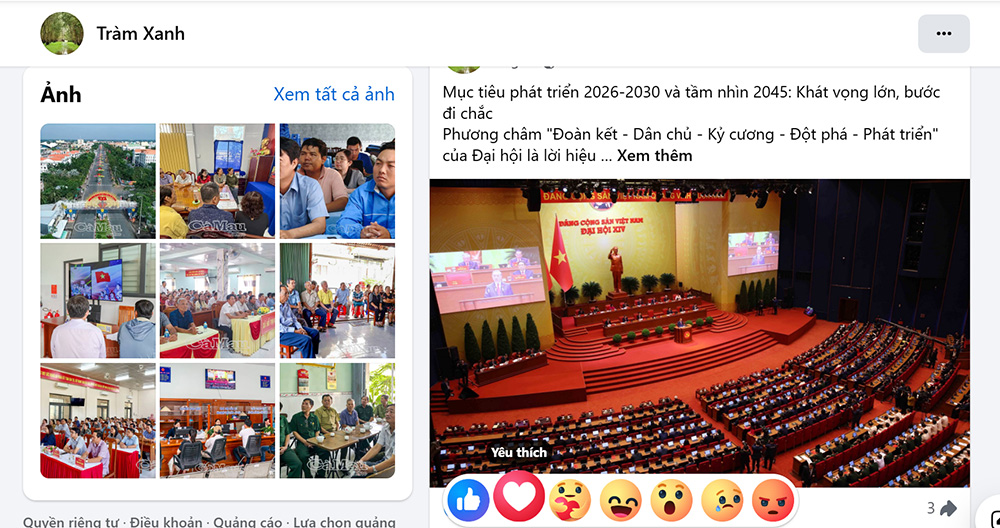 Trang cộng đồng Tràm Xanh (trên Facebook) “phủ” thông tin Đại hội XIV của Đảng, bao gồm hoạt động của Đoàn Đại biểu tỉnh Cà Mau tại Đại hội và cán bộ, Nhân dân địa phương hướng về sự kiện chính trị trọng đại của Đảng và dân tộc.