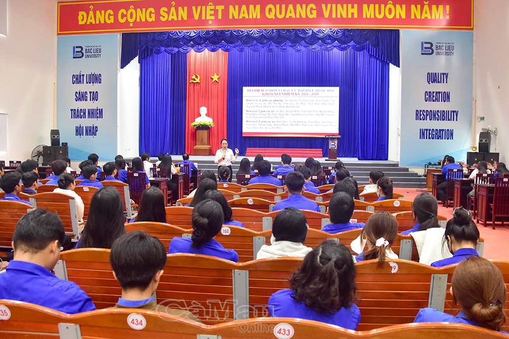Báo Cà Mau Sáng 7/3, hơn 210 sinh viên Trường Đại học Bạc Liêu được hiểu hơn về cuộc bầu cử đại biểu Quốc hội khoá XVI và đại biểu HĐND các cấp nhiệm kỳ 2026-2031 thông qua chương trình tuyên truyền do Tỉnh đoàn Cà Mau phối hợp với Đoàn trường tổ chức.