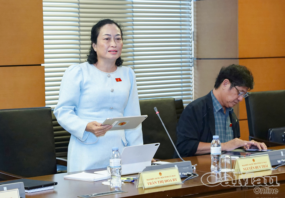 Đại biểu Trần Thị Hoa Ry nhấn mạnh cần phát huy vai trò đồng bào dân tộc trong quản lý, bảo vệ rừng, rút ngắn chu kỳ cập nhật kế hoạch thích ứng biến đổi khí hậu, và xây dựng cơ sở dữ liệu quốc gia về khu vực nhận chìm vật chất ở biển.
