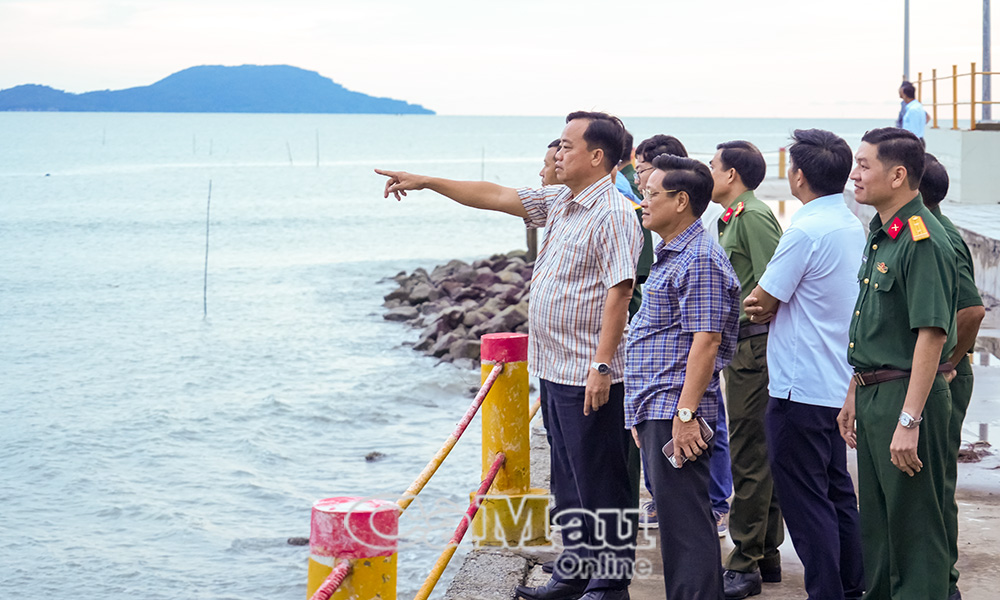 Đồng chí Huỳnh Quốc Việt, Ủy viên dự khuyết Ban Chấp hành Trung ương Đảng, Phó Bí thư Thường trực Tỉnh ủy, Chủ tịch Ủy ban MTTQ Việt Nam tỉnh Cà Mau (người đứng đầu) trong chuyến kiểm tra tiến độ thi công cầu vượt biển nối ra đảo Hòn Khoai.